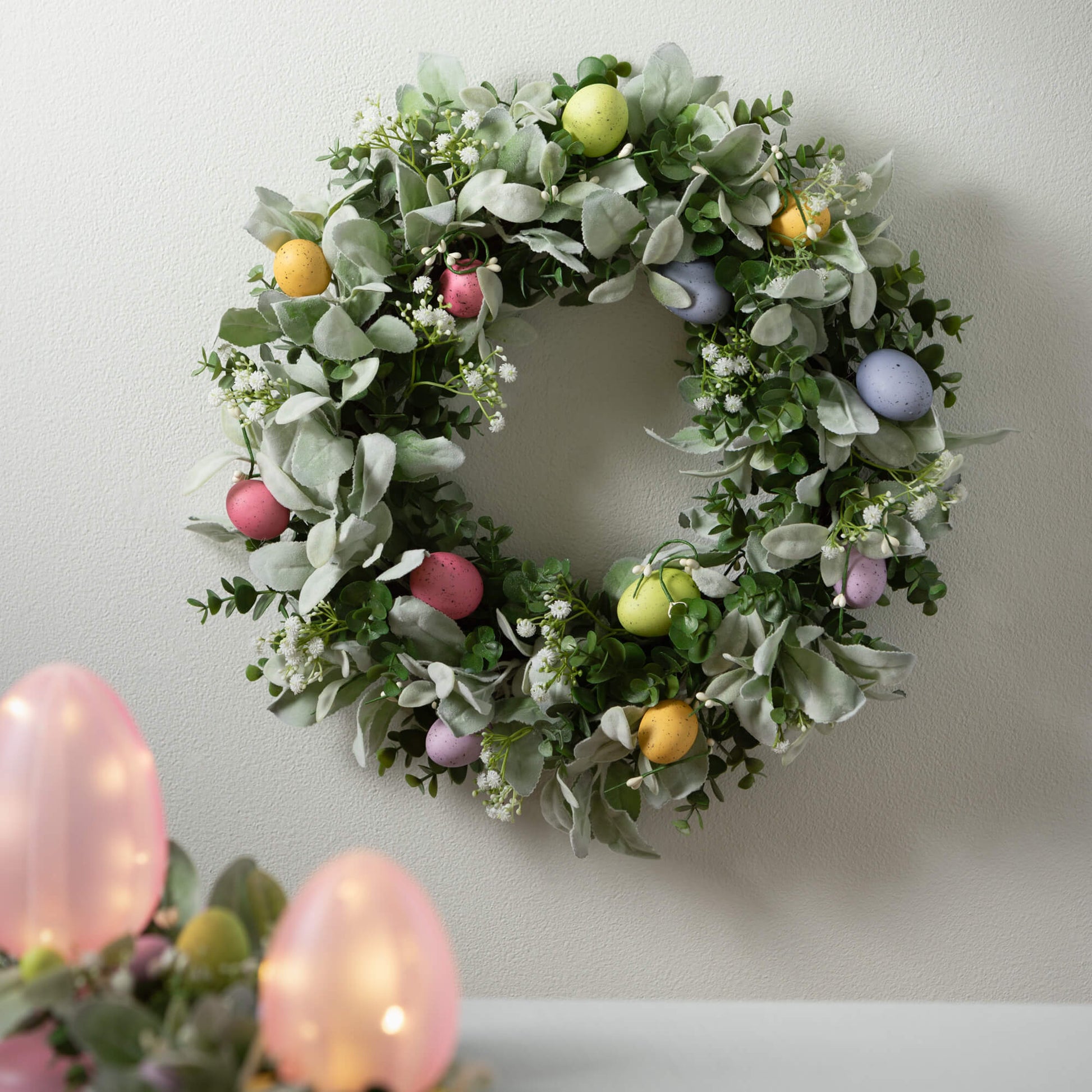 Hop into spring with this enchanting Egg Foliage Wreath. Lush, verdant foliage frames a cluster of speckled pastel eggs, creating a charming Easter display that's as vibrant as it is whimsical. These colorful eggs are the perfect blend of rustic and refined, adding a touch of natural elegance to any space. Whether you hang it on your front door or style it above a mantel, this wreath is sure to delight with its effortless blend of spring greenery and seasonal accents. Bring the beauty of the season home with this effortlessly chic Egg Foliage Wreath.